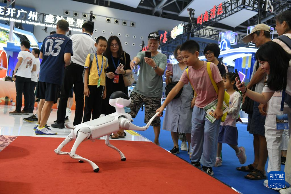 9月13日,在2025廣東國際旅游產業博覽會現場,觀眾與萌寵機器狗互動。新華社發(許建梅攝)